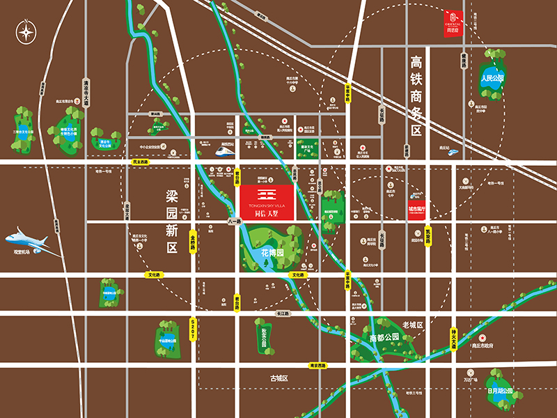 1、花博園;2、廉政廣場公園;3、秋實公園;4、商周文化公園;